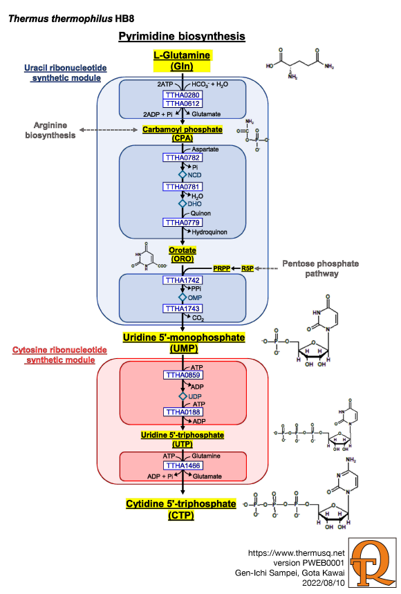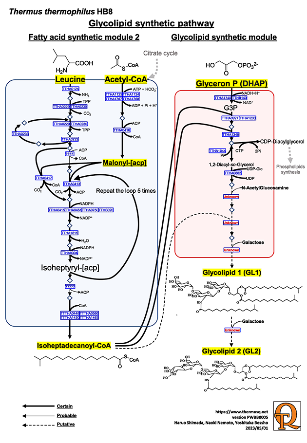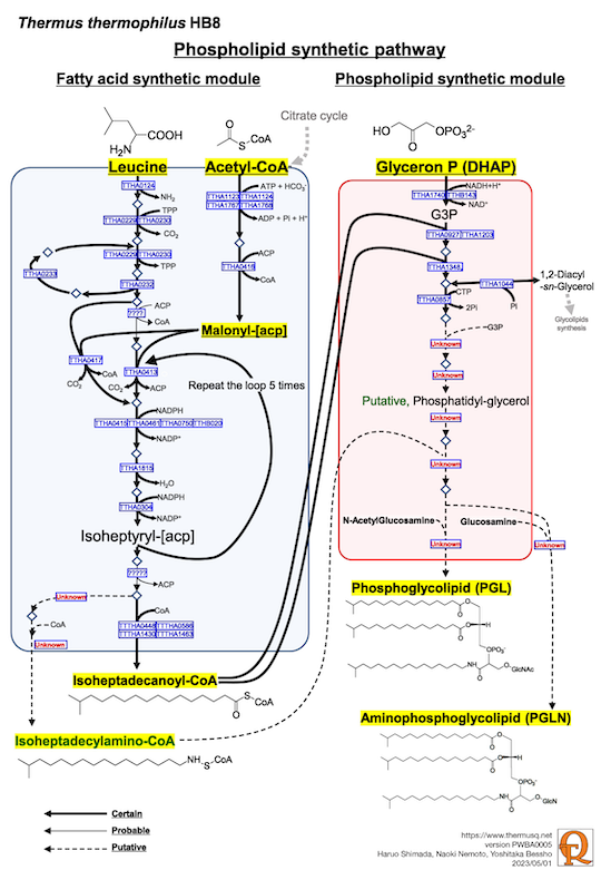 There are many unique biological pathways in T. thermophilus that are not well described in KEGG database, for instance. Each organism may adopted variations in the common pathways. Following list is the knowledge of pathways gathered from T. thermophilus community. The effort of gathering is still on going.